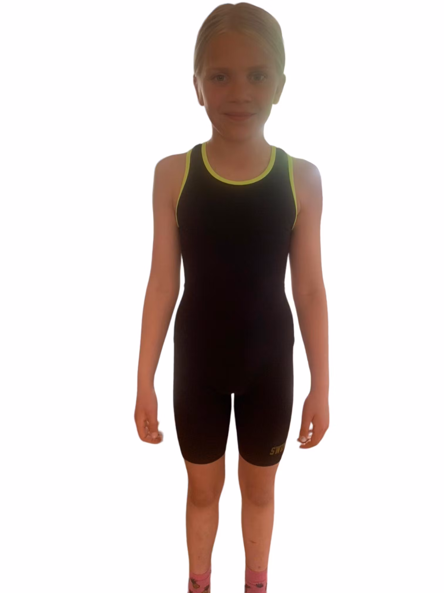 Baddräkt för flickor - Knälång dräkt. Baddräkt för simträning eller simtävling. Bra pris, bra passform och håller bra mot klor. Svart med detaljer i neon.